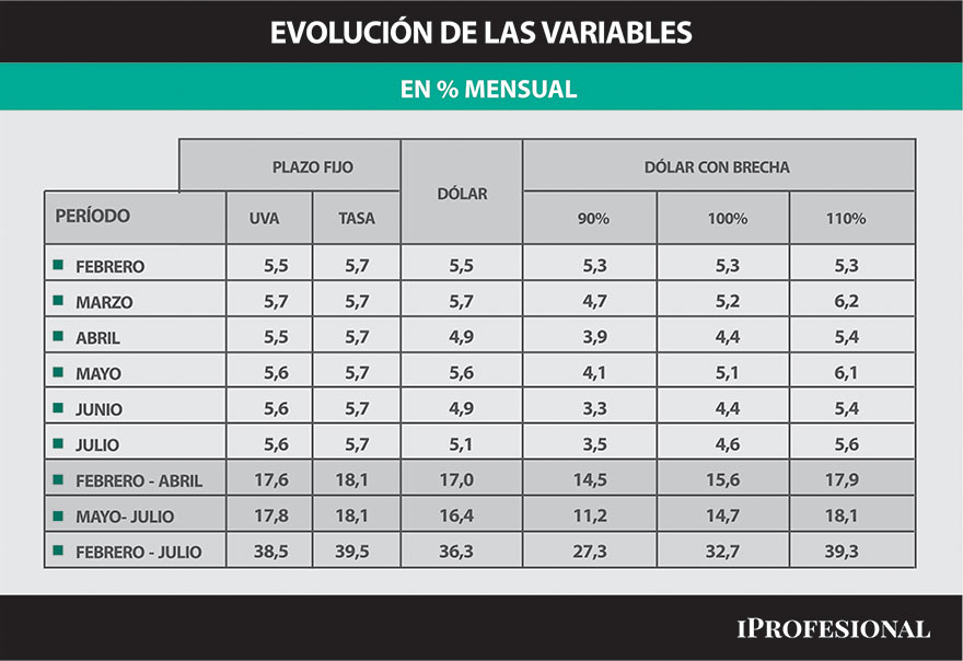 Con respecto al semestre en su totalidad, lo más rentable sería el plazo fijo tradicional, pues del acumulado de los respectivos vencimientos se obtendría un incremento que se acercaría al 40%, relegando aun segundo plano al blue si la brecha trepara hasta el 110% en vísperas de las PASO de mediados de agosto próximo.