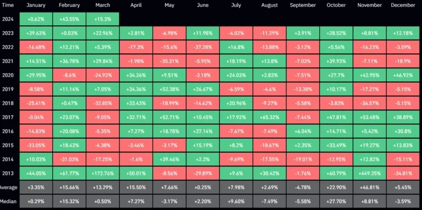 Al evaluar los datos compartidos por Coinglass, desde el 2013, el precio de Bitcoin han experimentado rendimientos mayoritariamente positivos durante los meses de abril.