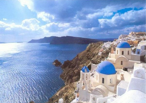 Santorini tomó su forma actual al hundirse la caldera de un enorme volcán. Su capital es el pueblo de Thira y su principal puerto el de Acinios.
