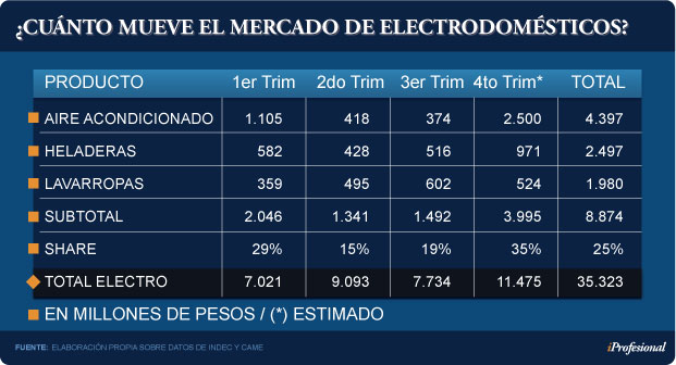 De ese total, los equipos de aire acondicionado, heladeras y lavarropas, fueron responsables del 25%, lo que equivalió a casi $9.000 millones (ver cuadro).