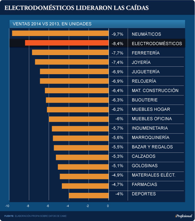 El hecho de que el Gobierno esté apuntando a empujar la demanda de electrodomésticos no es casual: según la CAME, el año pasado fue uno de los sectores que más cayó, con una baja del orden del 8%, tal como se observa en el siguiente cuadro: