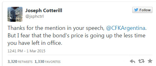Pero el propio periodista inglés le contestó a la Presidenta, a los pocos minutos por la web: "Gracias por la mención en su discurso, @CFKArgentina. Pero me temo que el precio de los bonos va subiendo a medida que a usted le queda menos tiempo para dejar su cargo".