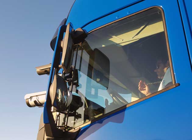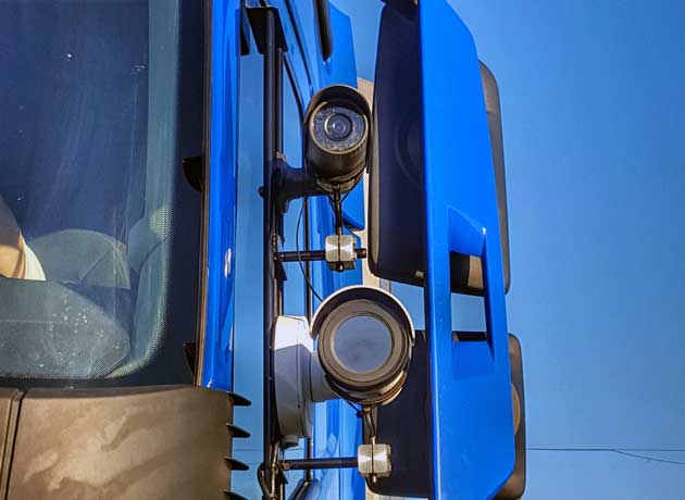 Las cámaras, una de ellas con rayos infrarrojos para situaciones nocturnas o de niebla, registran imágenes de la ruta frente al camión, y el sistema las transmite al panel trasero de cuatro pantallas de 3 mil nits: