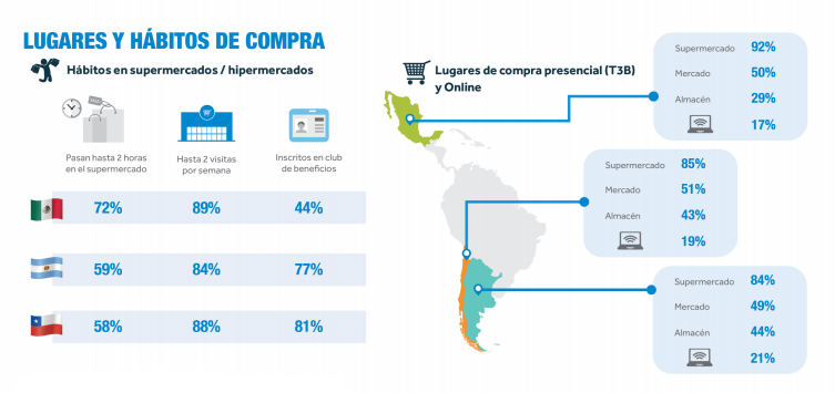Por otro lado, más del 80% de los encuestados en cada uno de los países visitan hasta 2 supermercados por semana y más del 50% pasa hasta 2 horas por semana en ellos. "El almacén es otro canal importante en Argentina (49%) y Chile (43%), tal como lo es el mercado en México (50%)", agrega el ejecutivo.