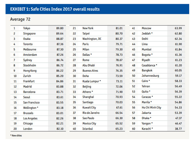 Buenos Aires fue elegida la ciudad más segura de Latinoamérica, según el informe Safe Cities Index 2017 elaborado por la revista británica The Economist, en una lista que encabezan Tokio, Singapur y Osaka.