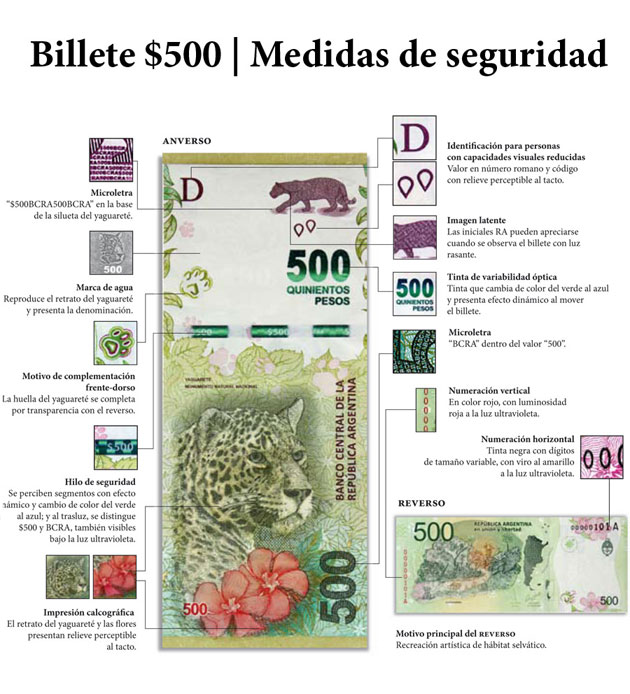 "La nueva familia de billetes busca resaltar nuestras riquezas naturales y concientizar sobre la preservación de nuestro medio ambiente. Cuenta con las más estrictas medidas de seguridad y con un novedoso diseño vertical en su anverso. En la actualidad, ya se encuentran cuatro denominaciones en circulación: $1.000 (con la imagen del hornero), $500 (yaguareté), $200 (ballena franca austral) y $20 (guanaco)", señaló el BCRA en un comunicado.