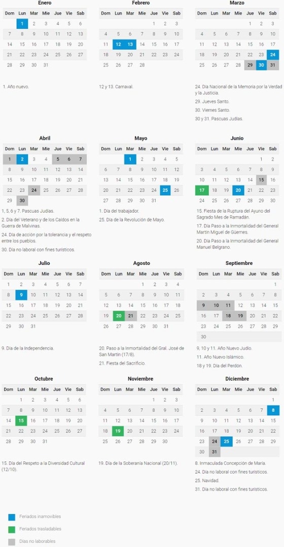 Asimismo, el 24 de marzo también es el feriado por el Día Nacional de la Memoria por la Verdad y la Justicia. Los trabajadores que tengan jornada laboral el día sábado podrán disfrutar de un día libre o bien recibir el pago con el recargo de feriado.