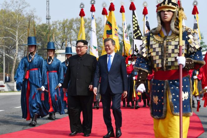 Una guarnición de honor escoltó a ambos líderes hacia el Pabellón de la Paz, donde se celebraron las conversaciones. En el camino, ambos mandatarios conversaron de manera afable por una gran alfombra roja desplegada por Seúl.