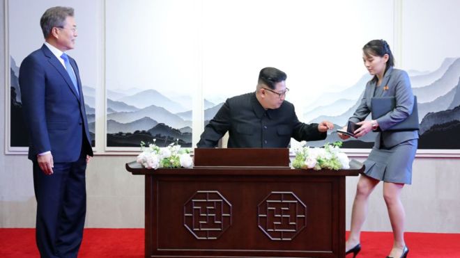 Antes de comenzar la sesión matutina de conversaciones, Kim escribió en el libro de honor: "Es tiempo para la paz y para empezar un nuevo momento en la historia".
