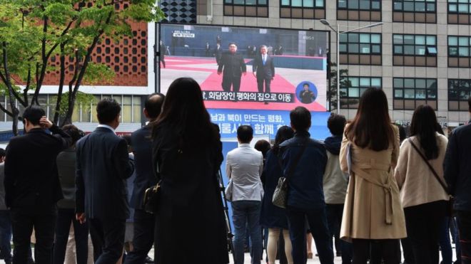 Como dijo Moon al comenzar la reunión, el mundo "está pendiente" de la cumbre intercoreana y del éxito que tenga. Aquí, una muestra de ello, en las calles de Seúl.
