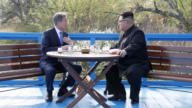 Los líderes almorzaron en el pueblo fronterizo de Panmunjom en Paju, South Korea. En la declaración conjunta que hicieron más tarde, se comprometieron a poner fin a "las actividades hostiles" entre las dos naciones.
