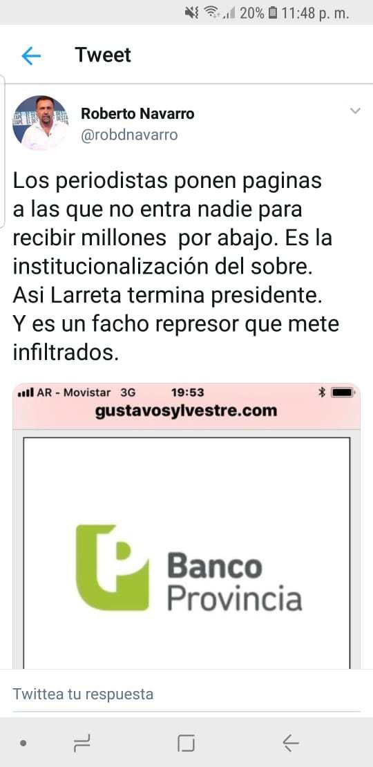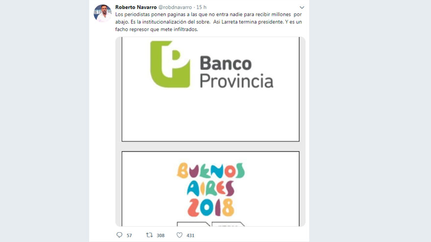 “Los periodistas ponen paginas a las que no entra nadie para recibir millones por abajo. Es la institucionalización del sobre. Asi Larreta termina presidente. Y es un facho represor que mete infiltrados”, disparó.
