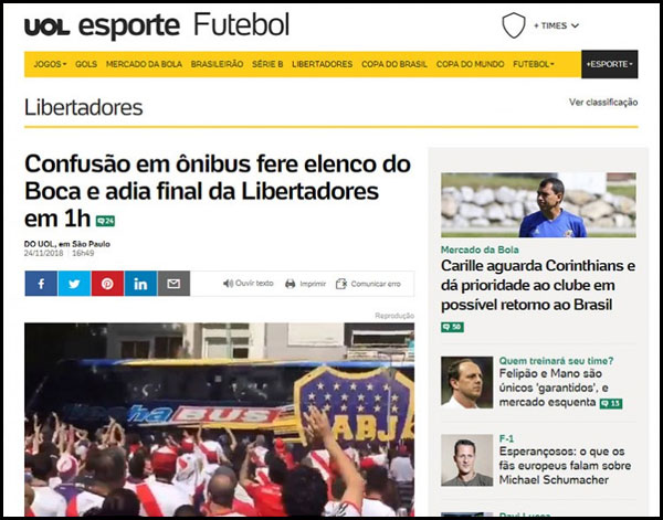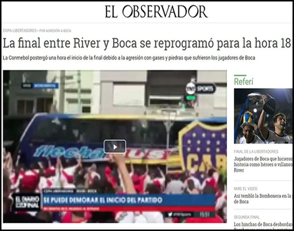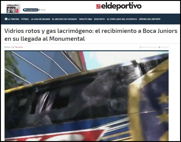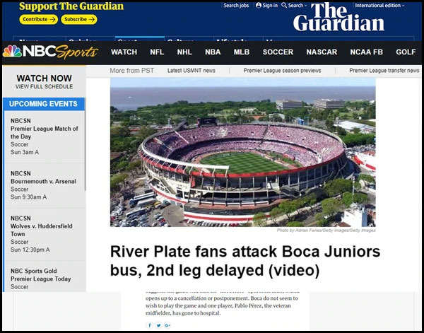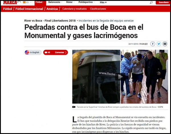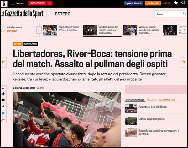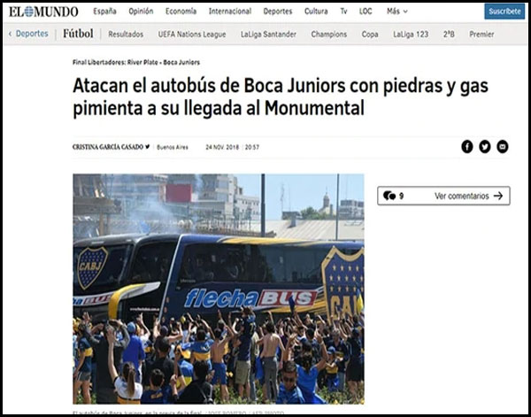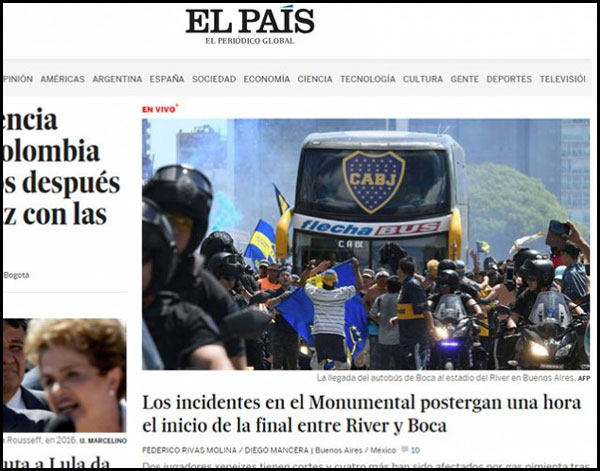 Los incidentes ocurridos en los alrededores al estadio de River Plate, durante el arribo del plantel de Boca Juniors, generaron repercusiones en todo el mundo. Los portales más prestigiosos de todo el planeta se hicieron eco del episodio ocurrido en las inmediaciones del Monumental.