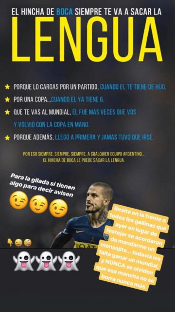 “Porque lo cargas por un partido, cuando te tiene de hijo. Por una copa, cuando él ya tiene seis. Que te vas al Mundial, él fue más veces que vos y volvió con la copa en la mano. Porque además, llegó a Primera y jamás tuvo que irse”, dice la imagen que compartió la joven. “Por eso siempre, siempre, siempre, a cualquier equipo argentino.. el hincha de Boca le puede sacar la lengua”, cerró.