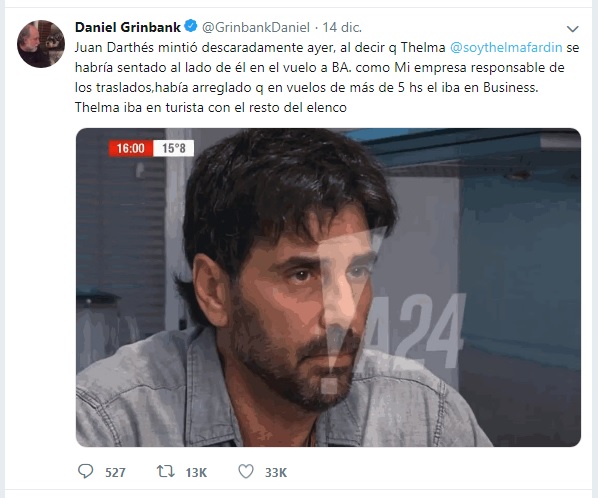 Daniel Grinbank, productor responsable de la gira en 2009 donde la actriz reveló que fue abusada sexualmente, hizo un fuerte descargo en las redes sociales: "En su entrevista de ayer Juan Darthés mintió descaradamente. Una de esas mentiras fue decir que Thelma habría viajado al lado de él en el vuelo de vuelta a Buenos Aires. El compromiso de transportación internacional de la delegación que él tenía convenido que en vuelos de más de 5 horas él viajaba en Business. Thelma viajo con el resto del elenco en turista. Seguís dando asco".