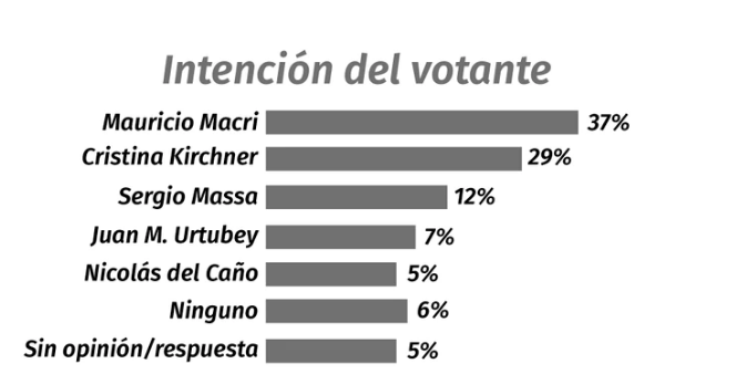 Con respecto a la intención de voto, el sondeo sostiene que los votantes siguen eligiendo a Macri. En ese sentido, señala que si las primarias de agosto se celebraran hoy, el 37% lo votaría a él y el 29% a Cristina Kirchner; marcando una ventaja más amplia que los famosos 3 puntos que separaban históricamente a un candidato de otro.