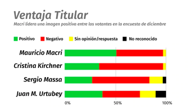 La consulta, que fue realizada entre el 15 y el 28 de diciembre a 2.000 entrevistados, ubica al Presidente mejor posicionado que su probable oponente, la ex mandataria Cristina Kirchner. Mientras que la imagen negativa de ella llega al 63%, la de Macri alcanza el 46 por ciento.