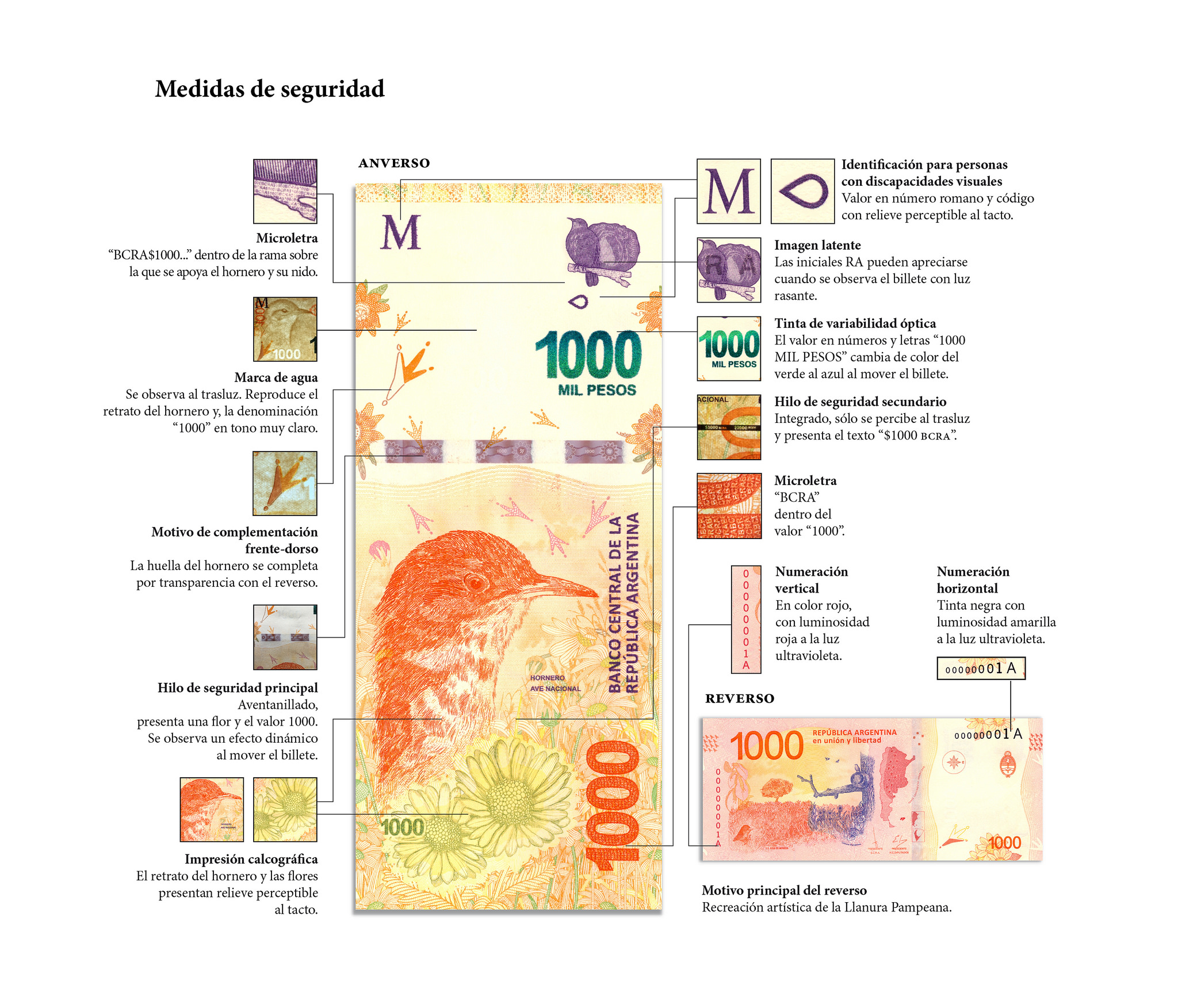 • Microletra: "BCRA$1000" dentro de la rama sobre la que se apoya el hornero y su nido y "BCRA" dentro del valor 1.000 pesos.