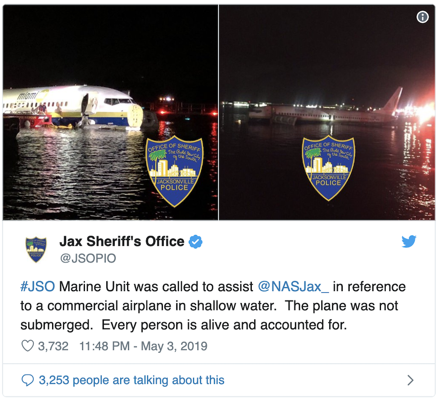 El hecho fue confirmado por el alcalde de la ciudad de Jacksonville, Lenny Curry, quien escribió en su cuenta de Twitter que "tenemos un avión comercial en el río".