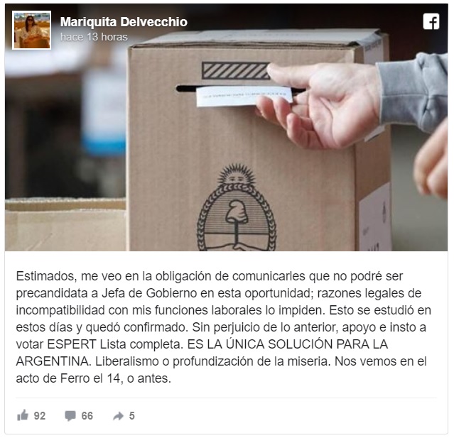 "Me veo en la obligación de comunicarles que no podré ser precandidata a jefa de gobierno en esta oportunidad". Con esas palabras, Mariquita Delvecchio, del Frente Despertar, anunció que se baja de la lista electoral que encabeza José Luis Espert .