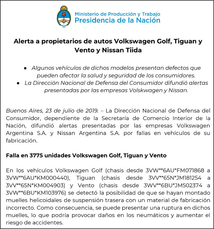 Según el comunicado, en los vehículos Volkswagen Golf (chasis desde 3VW**6AU*FM071868 a 3VW**6AU*KM000440), Tiguan (chasis desde 3VV**65N*JM181254 a 3VV**65N*KM004903) y Vento (chasis desde 3WV**6BU*JM502374 a 3VW**6BU*KM103976) se detectó la posibilidad de que se hayan montado muelles helicoidales de suspensión trasera con un material de fabricación incorrecto.