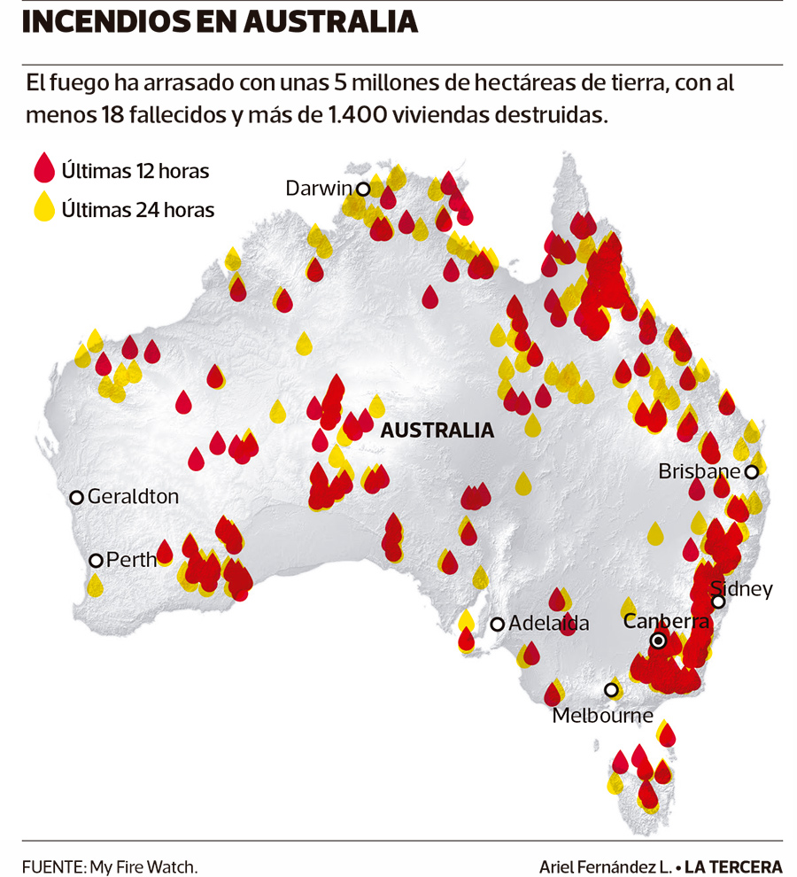 La peor temporada de incendios de la historia de Australia deja ya al menos 18 muertos, decenas de desaparecidos, miles de evacuados, especies enteras de animales y plantas devastadas por los incendios forestales y más de 5 millones de hectáreas arrasadas.