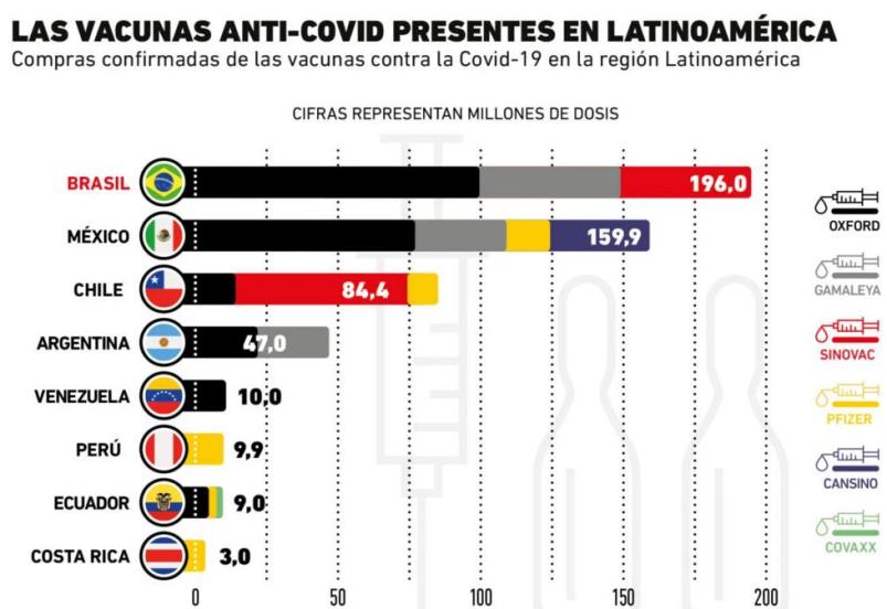 Con la llegada de la oferta de vacunas para la nueva enfermedad, las autoridades de los distintos países se han dado a la tarea de "salir de compras" para conseguir dosis de estas soluciones que permitirán aliviar la carga que han enfrentado con la cantidad de contagios. Este es un aspecto que ocurre ya en diversas partes del mundo y, por supuesto, en Latinoamérica no es la excepción. Las autoridades de las distintas naciones en la región ya han gestionado los pedidos de las distintas opciones de vacunas para brindarlas a su población.
