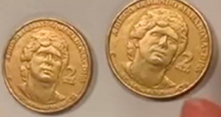Las monedas muestran en una cara, distintas imágenes de Maradona, como la inolvidable escena del gol con la mano, y en la otra el escudo de las armas de los borbones y corresponde a dos ducados, o dos euros, señaló MDZ.