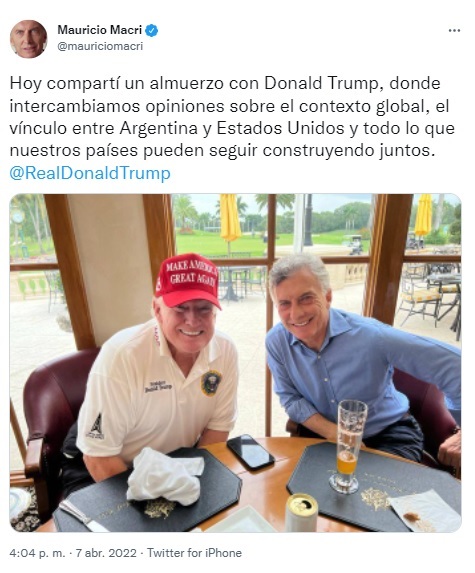 Luego de haber participado en el mundial de bridge, el ex presidente argentino Mauricio Macri se reunió con el ex mandatario de los Estados Unidos Donald Trump, durante su paso por ese país, y juntos dialogaron sobre la realidad mundial y la relación entre los dos estados.