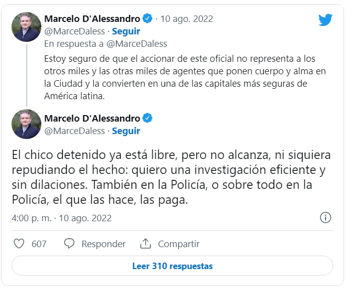 "Estoy seguro de que el accionar de este oficial no representa a los otros miles y las otras miles de agentes que ponen cuerpo y alma en la Ciudad y la convierten en una de las capitales más seguras de América Latina", sumó el Ministro, y cerró: "El chico detenido ya está libre, pero no alcanza ni siquiera repudiando el hecho: quiero una investigación eficiente y sin dilaciones. También en la Policía, o sobre todo en la Policía, el que las hace, las paga".