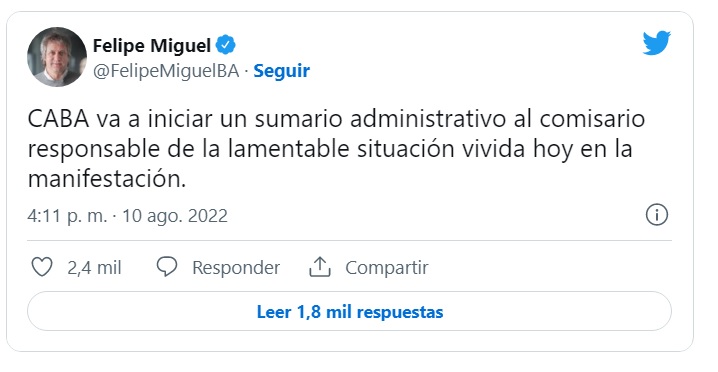 En la misma línea, el jefe de Gabinete porteño, Felipe Miguel remarcó: "CABA va a iniciar un sumario administrativo al comisario responsable de la lamentable situación vivida hoy en la manifestación".