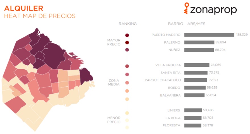 Al igual que el mes pasado, el barrio más barato para acceder al alquiler de una vivienda es Floresta ($58.378), seguido por La Boca ($58.705) y Liniers ($59.485). Mientras tanto, el ranking de los puntos de la Ciudad con los contratos más elevados lo lidera Puerto Madero con un alquiler que alcanza los $138.329. El podio se completa con Palermo y Núñez, que tienen como valores $89.894 y $88.794, respectivamente.