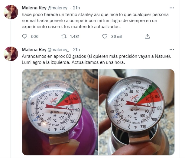 "Hace poco heredé un termo Stanley así que hice lo que cualquier persona normal haría: ponerlo a competir con mi Lumilagro de siempre en un experimento casero. Los mantendré actualizados", dijo.