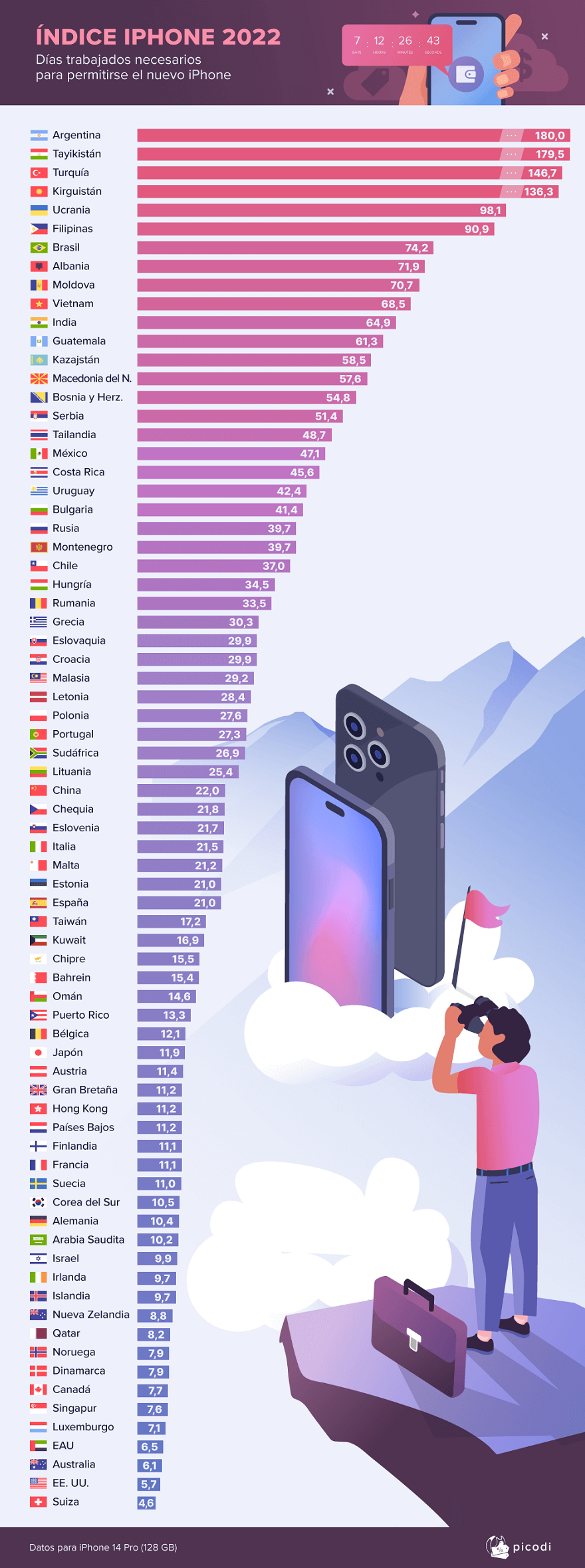 Se trata de la quinta lista que lanza el sitio Picodi.com, que compara el precio del iPhone 14 Pro (128 GB) con los ingresos en cada uno de los países y lo traduce en los días laborables necesarios para obtener el dinero que requiere la compra de dicho modelo.