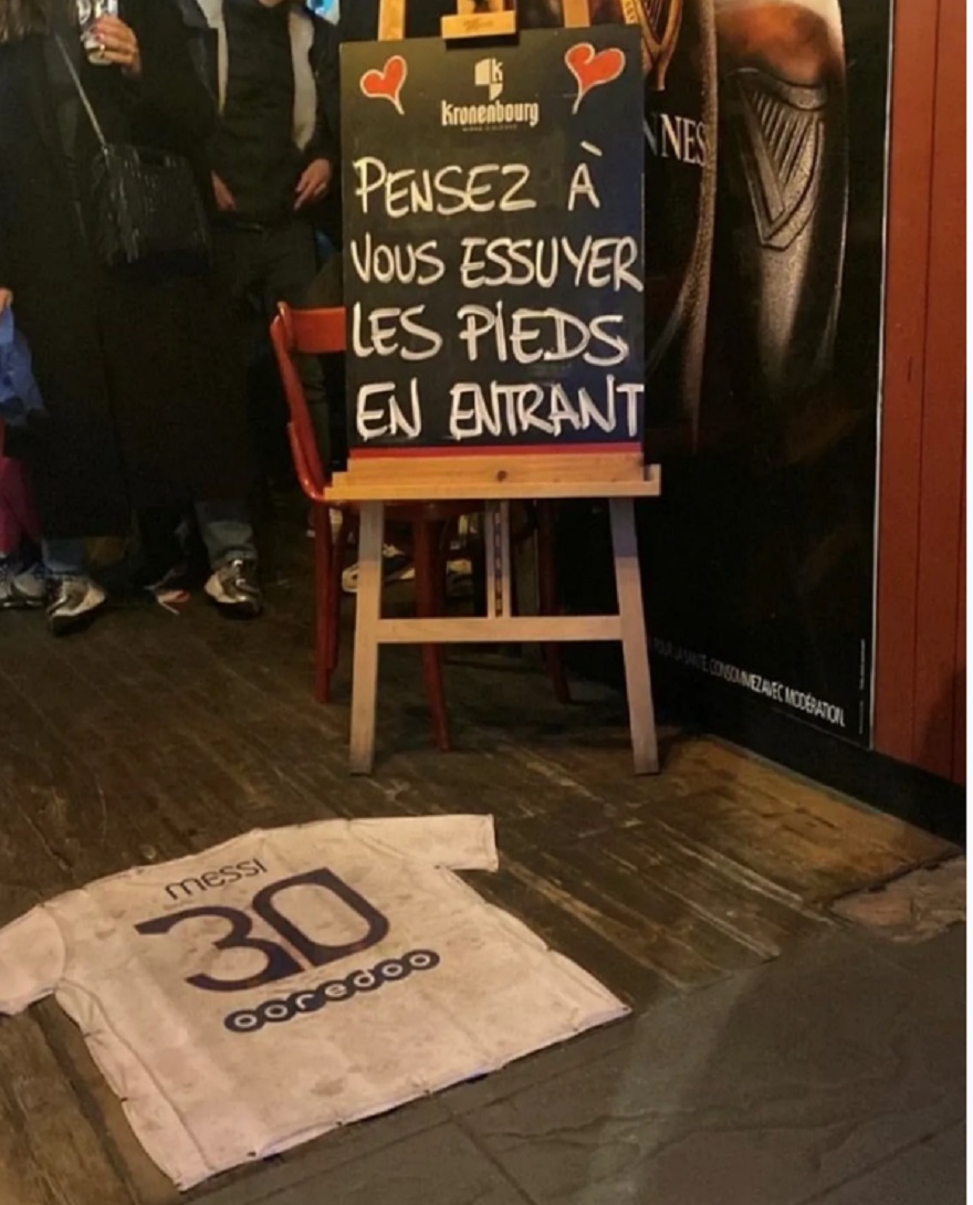 Eso no fue todo. Otra de las tristes postales que se viralizaron fue la de la puerta de un bar, con un pizarrón que decía: "Recuerde limpiarse los pies al entrar". Pero allí no había ninguna alfombra, sino una camiseta del Paris Saint Germain, con el nombre de Messi y su número 10. Se trata de la casaca blanca del club, en donde también juega Mbappé, solo que se la ve muy sucia por las pisadas de quienes ingresan.