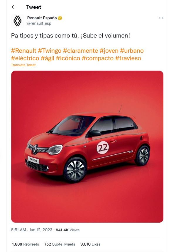 "Pa tipos y tipas como tú. ¡Sube el volumen!", dice el tuit haciendo referencia a la música. Ese breve texto es acompañado por una fotografía de la versión eléctrica del Twingo con el número 22 estampado en la puerta del vehículo en referencia a la edad de la nueva novia de Piqué. Después los hashtags que eligieron los creativos de la automotriz francesa: #claramente #joven #travieso, entre otros más sobre la marca.