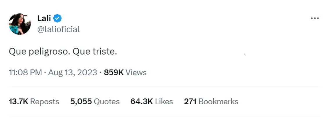 La publicación, que tuvo más de 64 mil likes, recibió varios comentarios a favor del libertario. "Peligroso es vivir con 120% de inflación y 50% de pobreza, genia"; "Peligroso es el peronismo Lali. Nadie puede tenerle miedo a la libertad, salvo los esclavos"; "Peligrosos son los que están", decían algunos de los mensajes.