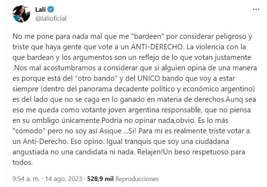 Frente a las reacciones en su contra, en las primeras horas de este lunes Lali volvió a referirse al tema y dejó en claro su postura: "No me pone para nada mal que me ‘bardeen’ por considerar peligroso y triste que haya gente que vote a un ANTI-DERECHO", comenzó destacando, ya que su primera intervención sobre el tema recibió críticas repetidas por varios de sus seguidores, que giraban en torno tanto a su falta de conexión con la realidad argentina e incluso señalaban que vive mucho tiempo fuera del país.