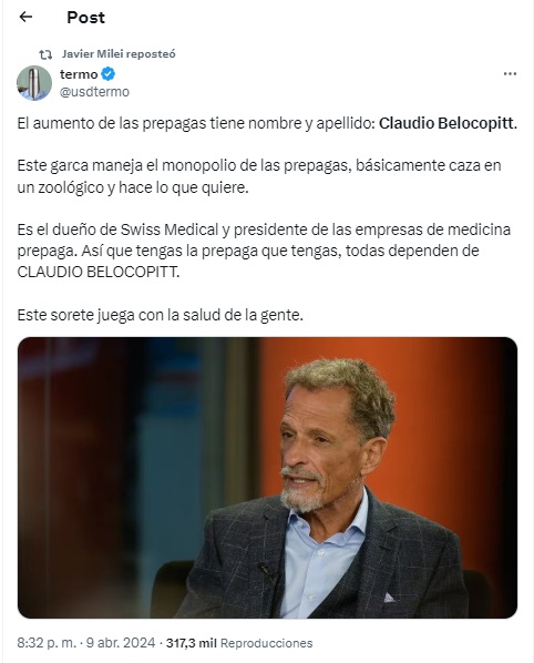 "El aumento de las prepagas tiene nombre y apellido: Claudio Belocopitt", afirmó el posteo del usuario "@usdtermo" que fue compartido por Milei.