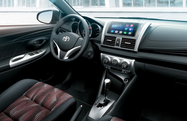 Por dentro, el nuevo Yaris tiene una mejor terminación y calidad que el Etios. El panel de instrumentos se divide en tres partes, donde se encuentra el tacómetro, el medidor de combustible y otros indicadores lumínicos. En el centro con borde cromado se encuentra el velocímetro y la computadora de abordo.