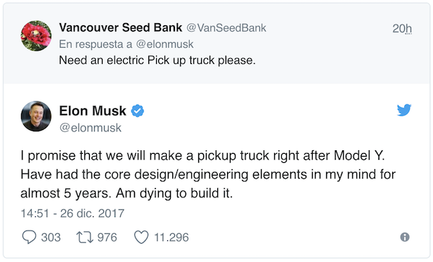 "He tenido los elementos básicos de diseño/ingenierí­a en mi mente durante casi 5 años. Me muero por construirlo", escribió Musk como respuesta en un hilo a un seguidor que pedí­a una "camioneta pickup eléctrica."