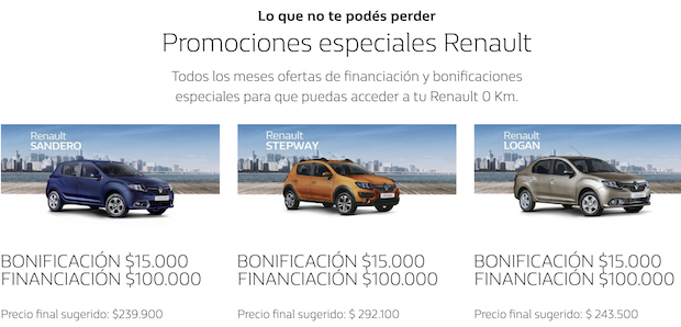 En Renault, las ofertas llegan para sus modelos más vendidos, con rebajas de $15.000. Por ejemplo el Sandero se ofrece desde $ 239.900 y el Logan, a partir de $243.500. Algunas versiones del SUV chico, Duster, y la pequeña pick up Oroch, también se pueden aprovechar con bonificaciones.