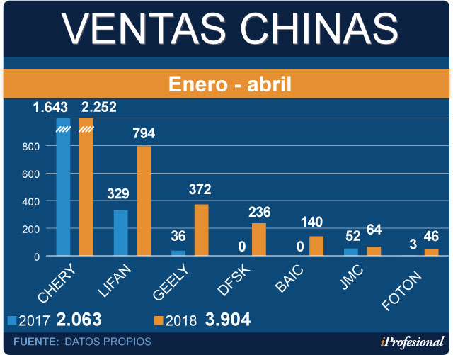 Si se toma en cuenta el primer cuatrimestre, los vehículos vendidos por los fabricantes chinos que están activos en el país (muchos confirmaron la llegada pero no la concretaron) sumaron 3.900 unidades.