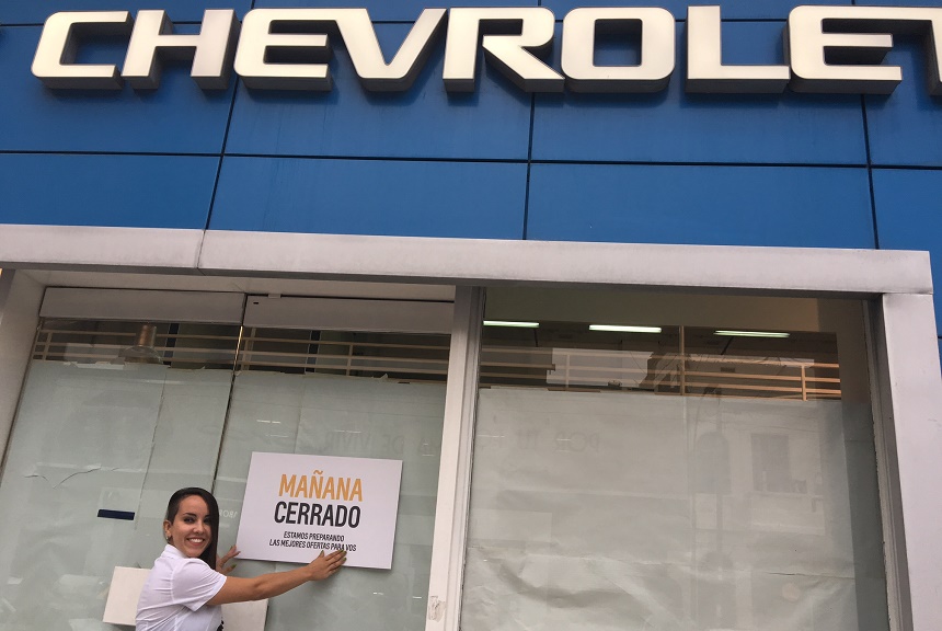 Minutos más tarde, otra de las responsables del lugar, pasaba con un cartel con grandes letras amarillas, (muy representativas del logo de la automotriz), con la frase "Mañana cerrado, estamos preparando las mejores ofertas para vos".