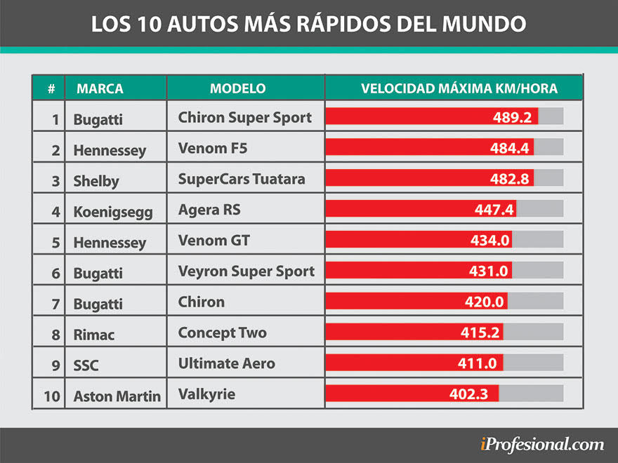 Los autos que se detallan a continuación son los modelos de producción más rápidos del planeta. Esto quiere decir que son unidades que se fabrican y que no son únicas o personalizadas, las cuales no se consideran.
