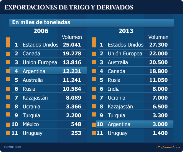 En la campaña iniciada en 2006, justo antes de que irrumpiera la política de intervención oficial, la Argentina ocupaba el cuarto puesto como mayor exportador de trigo y derivados, sólo superada por Estados Unidos, Canadá y la Unión Europea, de la mano de 12 millones de toneladas y un share del 10% en el comercio global de este cereal.