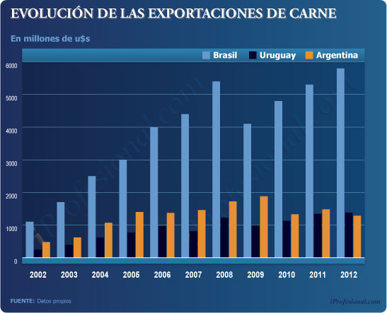 •Uruguay, con un 80% menos de cabezas de ganado, ya superó al país en cuanto a exportaciones de carne, tanto en valor como en volumen.