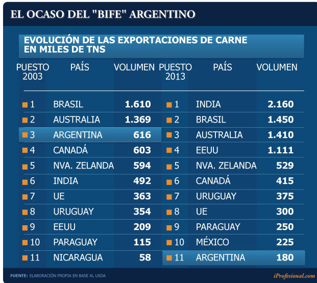 En la siguiente infografía se puede observar cómo, tras estar ubicada en el tercer puesto, ha ido quedando relegada del top 10 del ranking de países exportadores de carne, un hecho inédito en décadas: