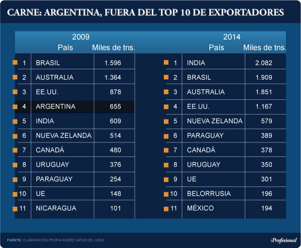 Actualmente, según el último relevamiento del Ministerio de Agricultura de los EE.UU., la Argentina ni siquiera figura entre los 11 principales exportadores, habiendo sido superada por países que hasta hace pocos años no tenían tradición en el mercado de carnes, como México o Bielorrusia (ver cuadro).