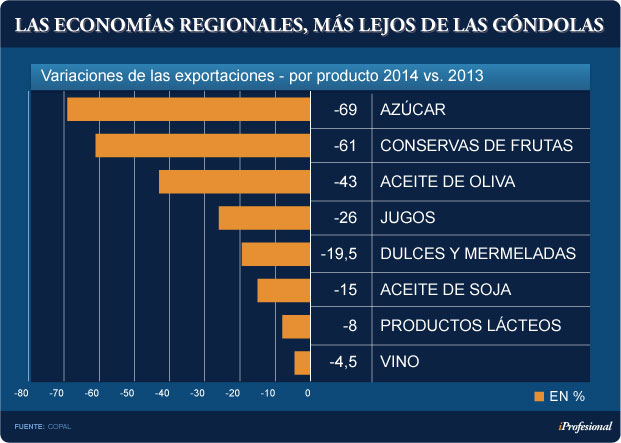 Según la COPAL, en 2014 las economías regionales generaron exportaciones por u$s12.100 millones, unos u$s800 millones menos que en 2013, lo que implicó una caída de más del 6%.